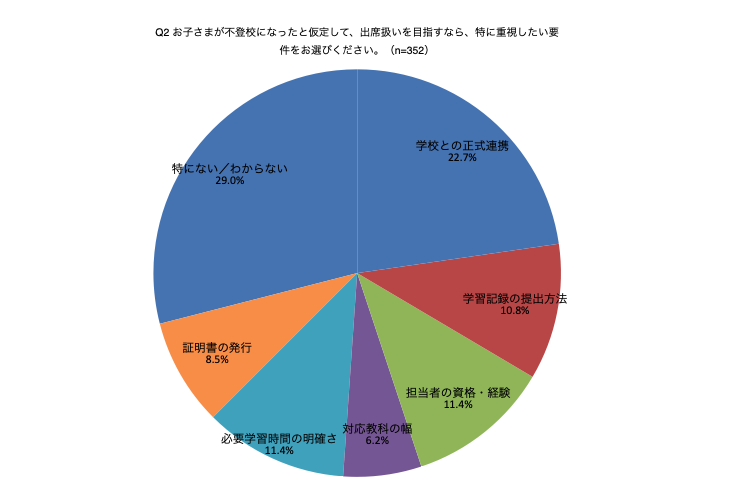 最多は「学校との正式連携」80件・22.7%。続いて「担当者の資格・経験」40件・11.4%、「必要学習時間の明確さ」40件・11.4%、「学習記録の提出方法」38件・10.8%、「証明書の発行」30件・8.5%、「対応教科の幅」22件・6.2%。一方で「特にない/わからない」も102件・29.0%と大きく、要件の“具体像”がつかみにくい実態もうかがえます(n=352)。実務では、学校と事業者の合意形成(誰が・いつ・何を確認するか)を最優先に、学習記録の形式・頻度、必要学習時間の基準、証明書の発行可否を事前に書面で確認。担当者の専門性と、各教科の扱い範囲も併せてチェックすると安心です。