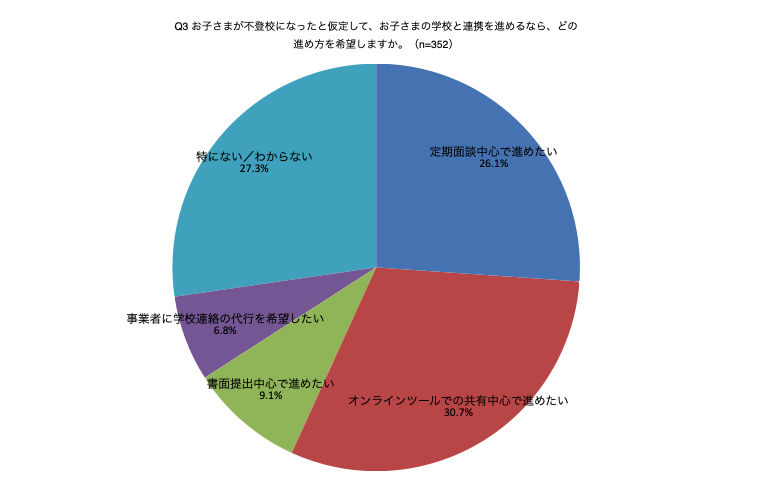 トップは「オンラインツールでの共有中心」108件・30.7%。次いで「特にない/わからない」96件・27.3%、「定期面談中心」92件・26.1%、「書面提出中心」32件・9.1%、「事業者による学校連絡の代行希望」24件・6.8%でした(n=352)。デジタル共有を軸に、必要に応じて面談で補完する“ハイブリッド運用”が現実的と言えます。家庭側は共有ツール・面談・書面の役割を整理し、誰が何を入力・保管・提出するかを明確化。プライバシー配慮と記録の冗長化(ツール+PDF化など)を意識すると、抜け漏れと齟齬を防ぎやすくなります。