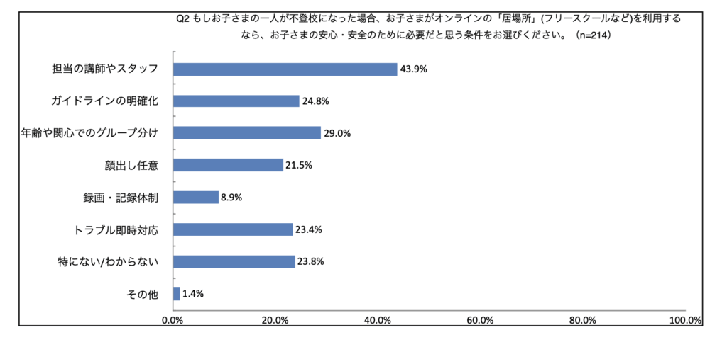 大切なお子様を預ける上で、どのような条件があれば安心できるかという質問(Q2)では、「担当の講師やスタッフ」がいることを挙げた方が43.9%と突出して多い結果となりました 。