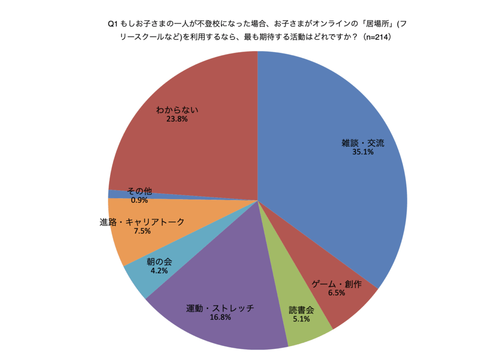 もしお子様がオンラインの居場所を利用する場合、どのような活動を期待するかという質問(Q1)に対し、最も多かった回答は「雑談・交流」で35.0%でした 。